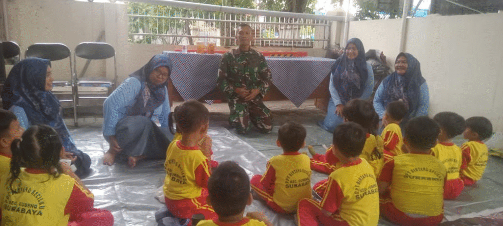Tampak dari Koramil Gubeng, yang diwakili dari Babinsa Serda Sumarno, juga hadir, dan menyapa anak anak PAUD yang hadir, sambil menyapa mereka dengan ramah.