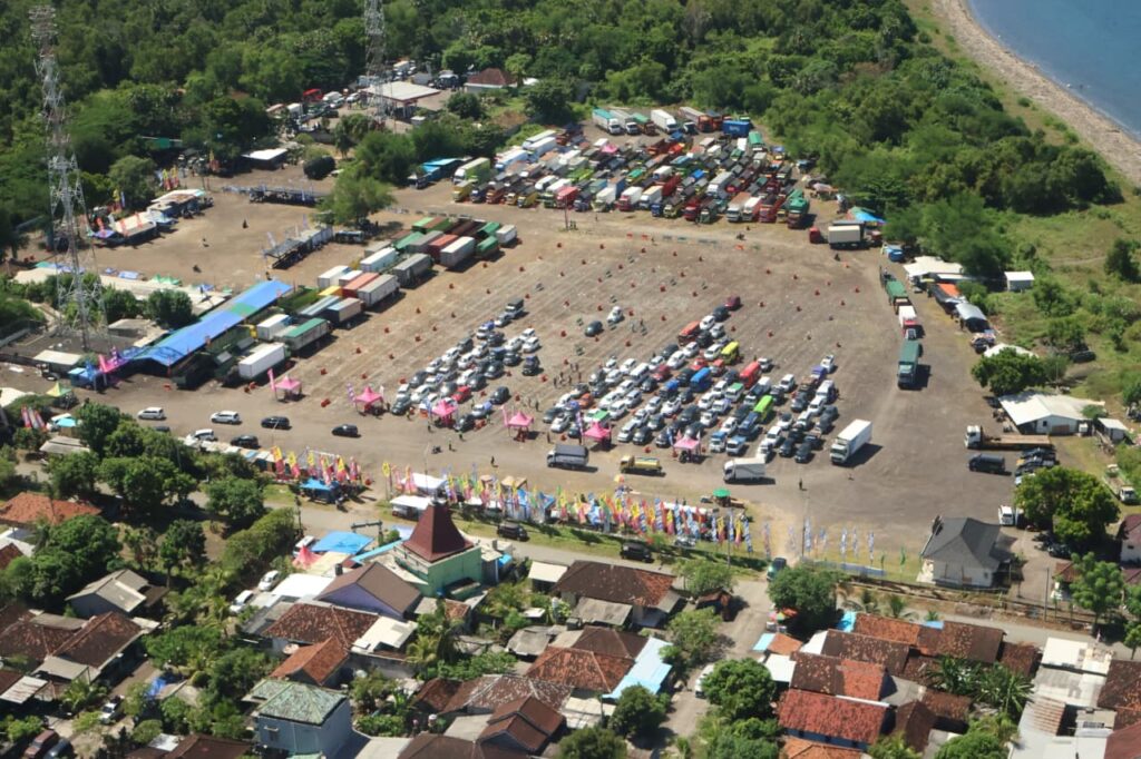 Dari ketinggian, rombongan memantau jalur utama menuju pelabuhan yang tampak dipadati kendaraan dari berbagai jenis. Antrean panjang terlihat mengular hingga puluhan kilometer, didominasi truk logistik, bus antar kota, serta kendaraan pribadi yang sabar menunggu giliran menyeberang.