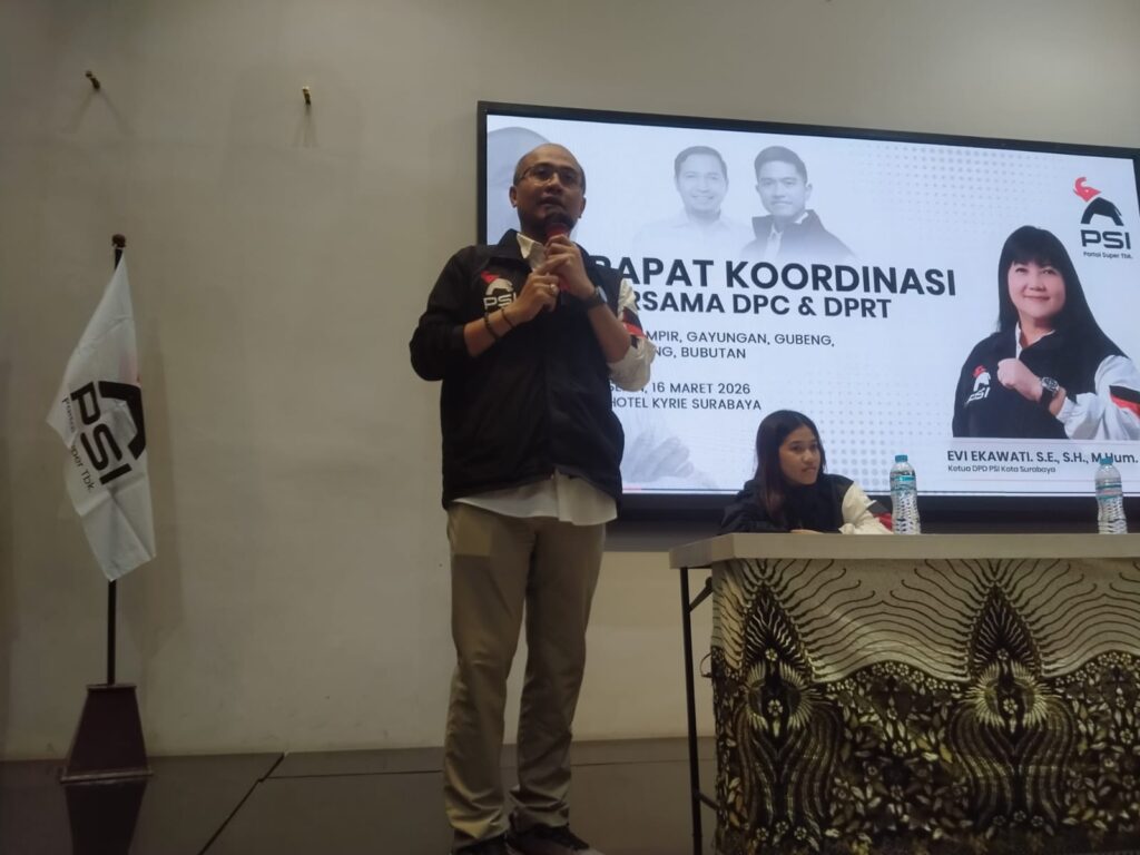 SURABAYA, liputankhususnews.online – Partai Solidaritas Indonesia (PSI) Kota Surabaya menggelar Rapat koordinasi bersama pengurus dan pengurus ranting se-Surabaya, yang berlokasi di Hotel KYRIE, Jalan Ciliwung, pada Senin (16/03/2026, pukul 19.00 WIB.